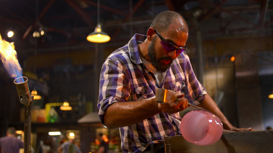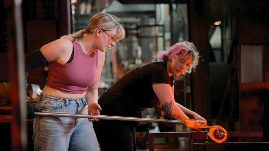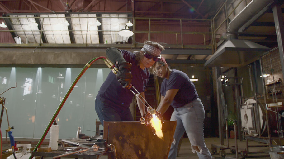 The artists employ techniques like color wrapping, hot sculpting and creating bubbles with baking soda as they craft eye-popping light fixtures.