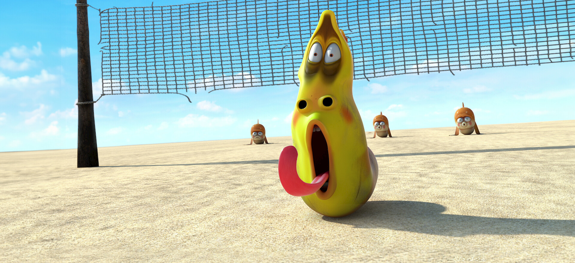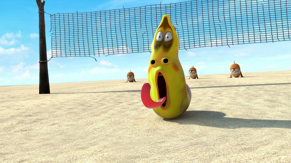 Larva friends Red and Yellow wake up to find themselves on a tropical island with exotic animals -- and one gigantic creature.