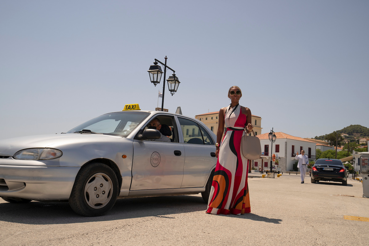 Andi’s last-minute appearance is especially surprising for at least one person on this idyllic vacation. After all, dead people don’t usually get dressed up for a jet-set jaunt on the Aegean. As detective Benoit Blanc (Daniel Craig) reveals during the film’s giddy twist, Andi was actually murdered by someone in the party gathered within Bron’s Glass Onion atrium. The person they’ve all believed to be Andi is actually… Helen Brand, her twin sister, who is also played by Monáe. After hiring Blanc to investigate her sister’s death, Helen posed as Andi in order to help him gather clues from the group. In that moment, everything comes full circle — hence, Eagan’s penchant for geometric shapes. And if you pay attention, you’ll start seeing circles everywhere: her belt as she walks to the pool, her oversized sunglasses, the red swirl pattern on the bottom of her dress. It all points to the truth.